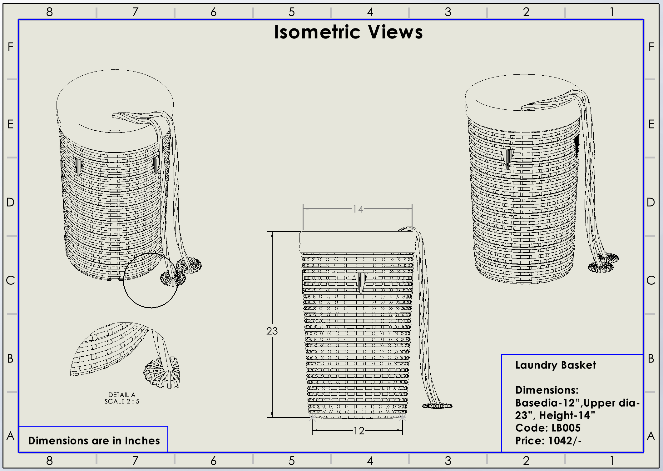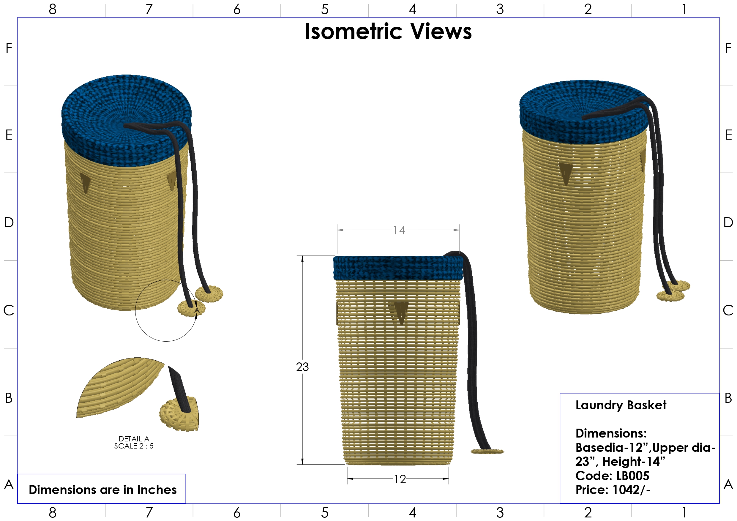 ମୂଳ ବ୍ୟାସ -୧୨", ଉପର ବ୍ୟାସ -୨୩", ଉଚ୍ଚତା -୧୪”