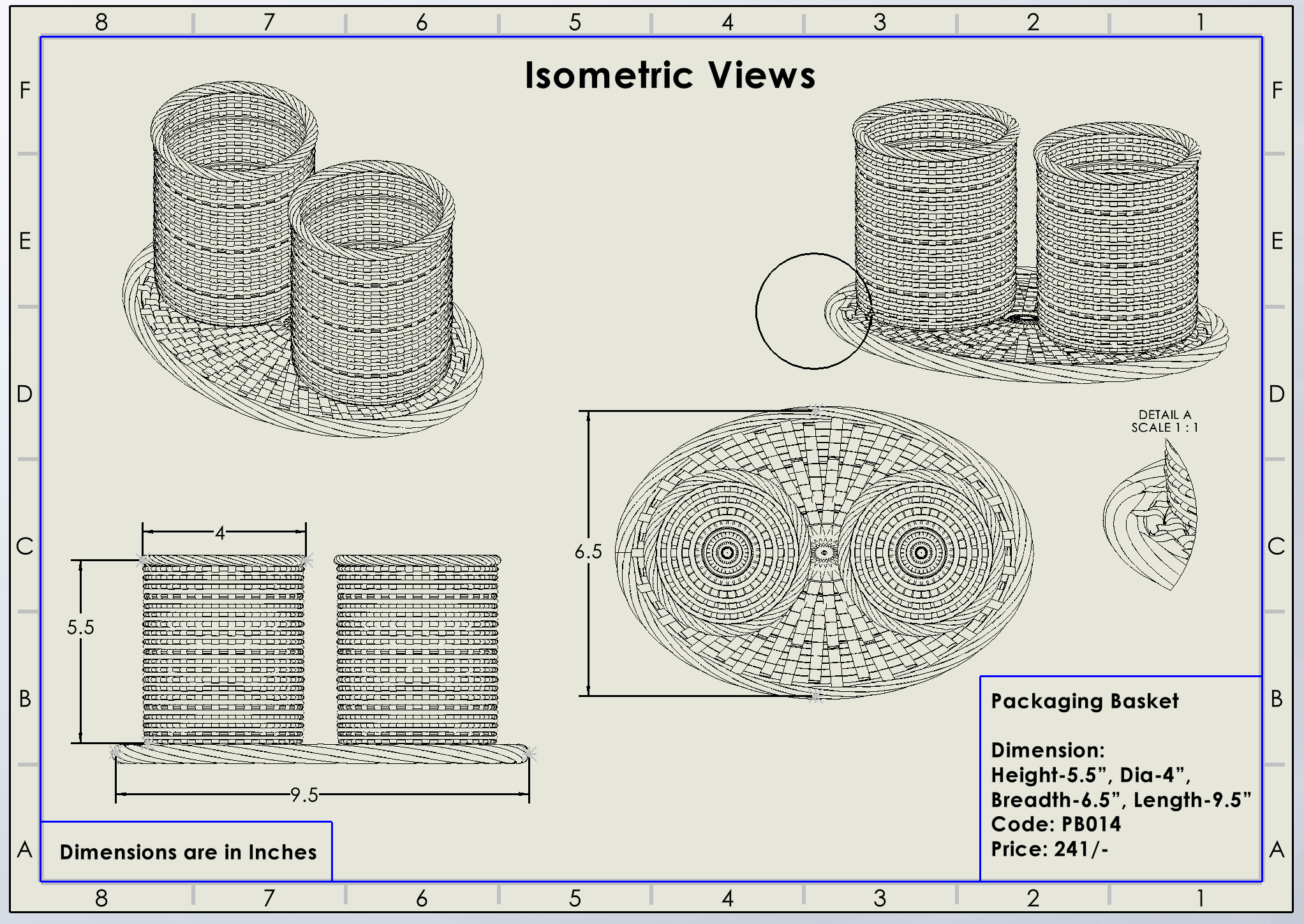 ଉଚ୍ଚତା -୫.୫”, ବ୍ୟାସ -୪", ପ୍ରସ୍ଥ -୬.୫", ଲମ୍ବ -୯.୫"